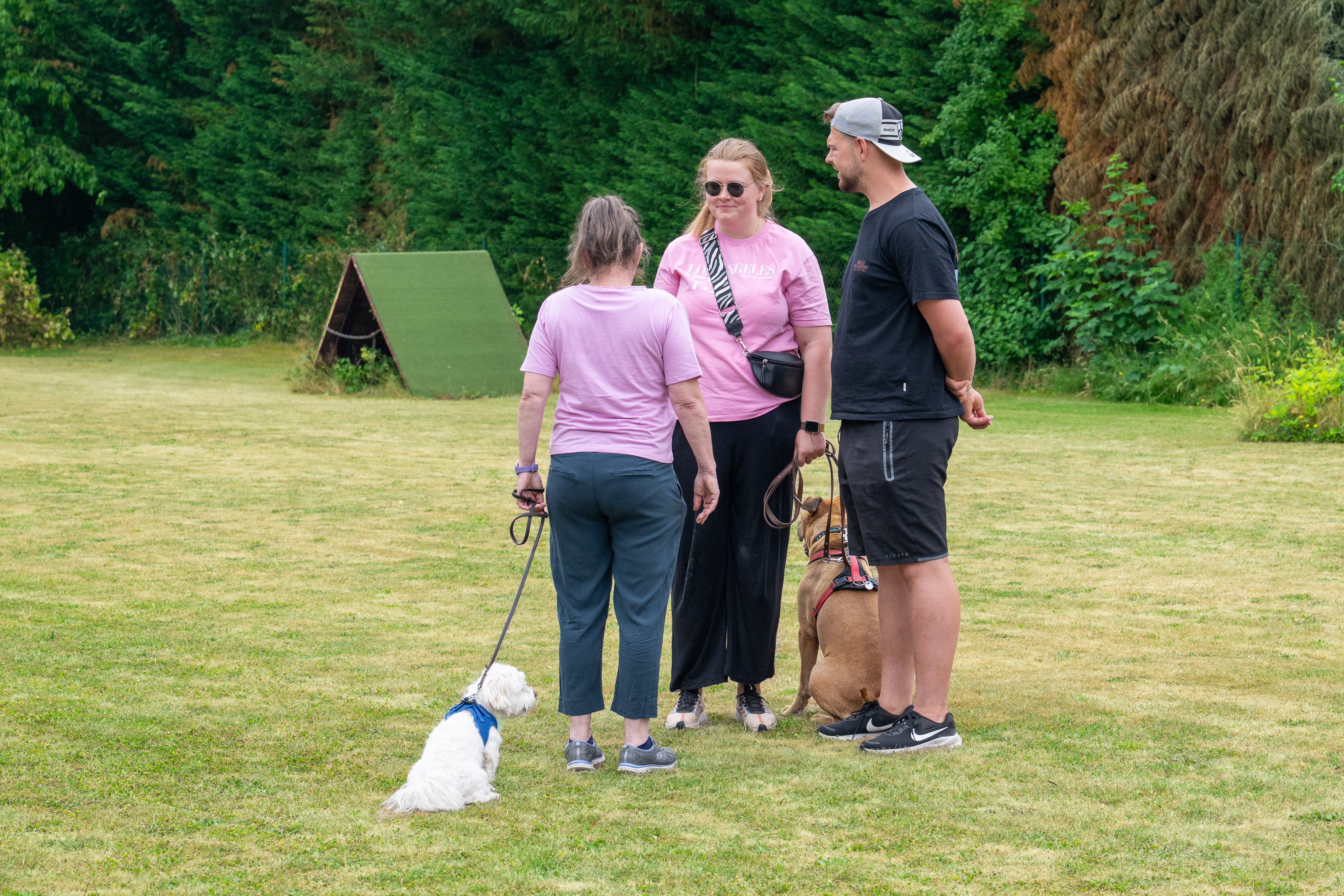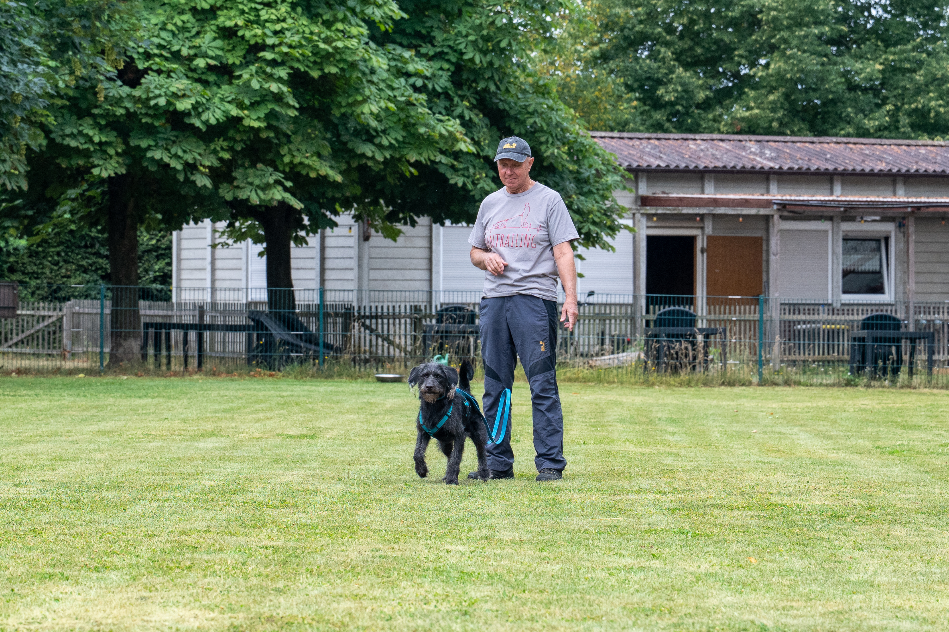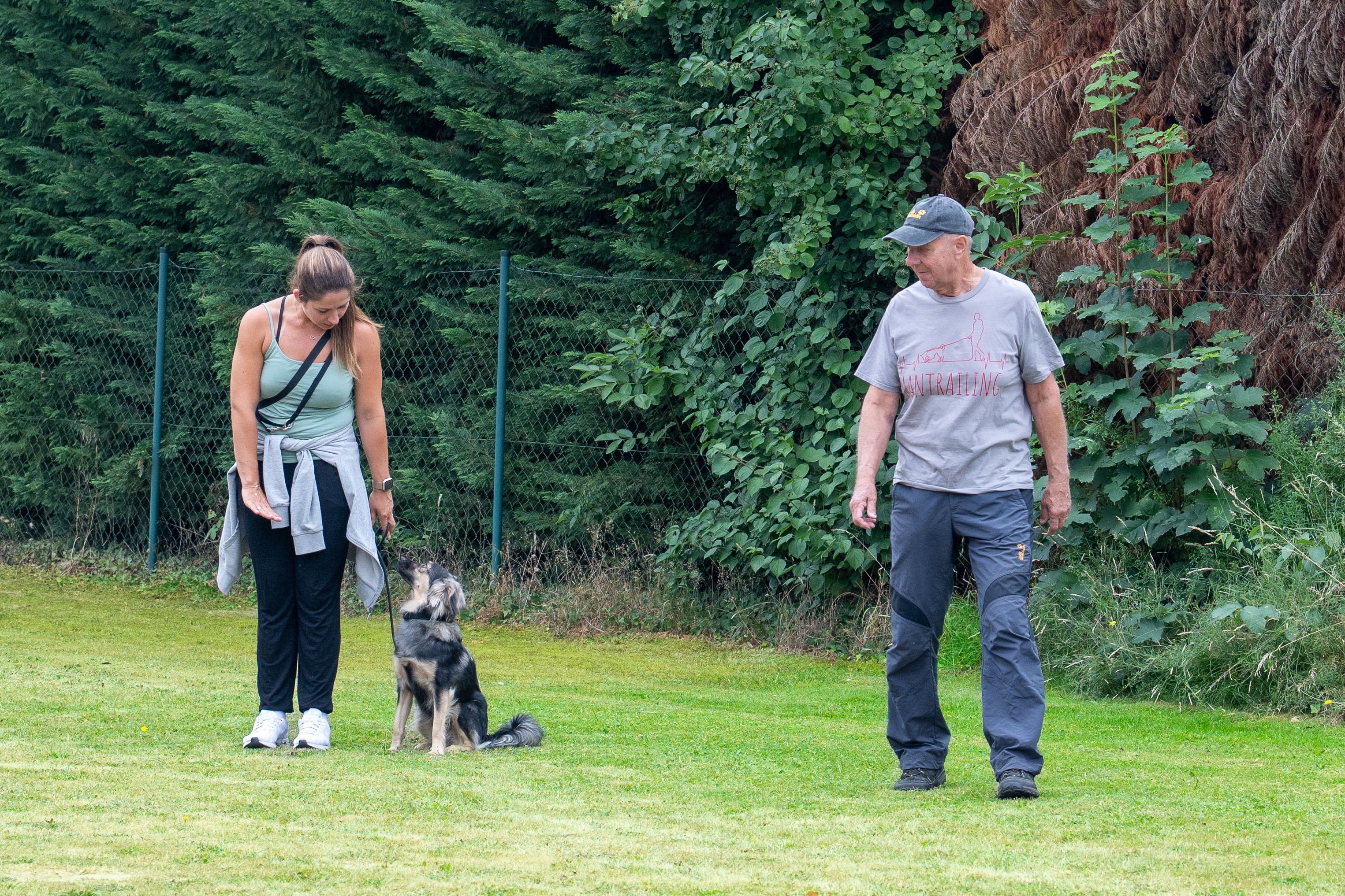 Individuelles Training Mensch-Hund, hier breitet sich der Mensch vor was er in der Trainigseinheit verbessern möchte und der Trainer unterstützt ihn dabei.
