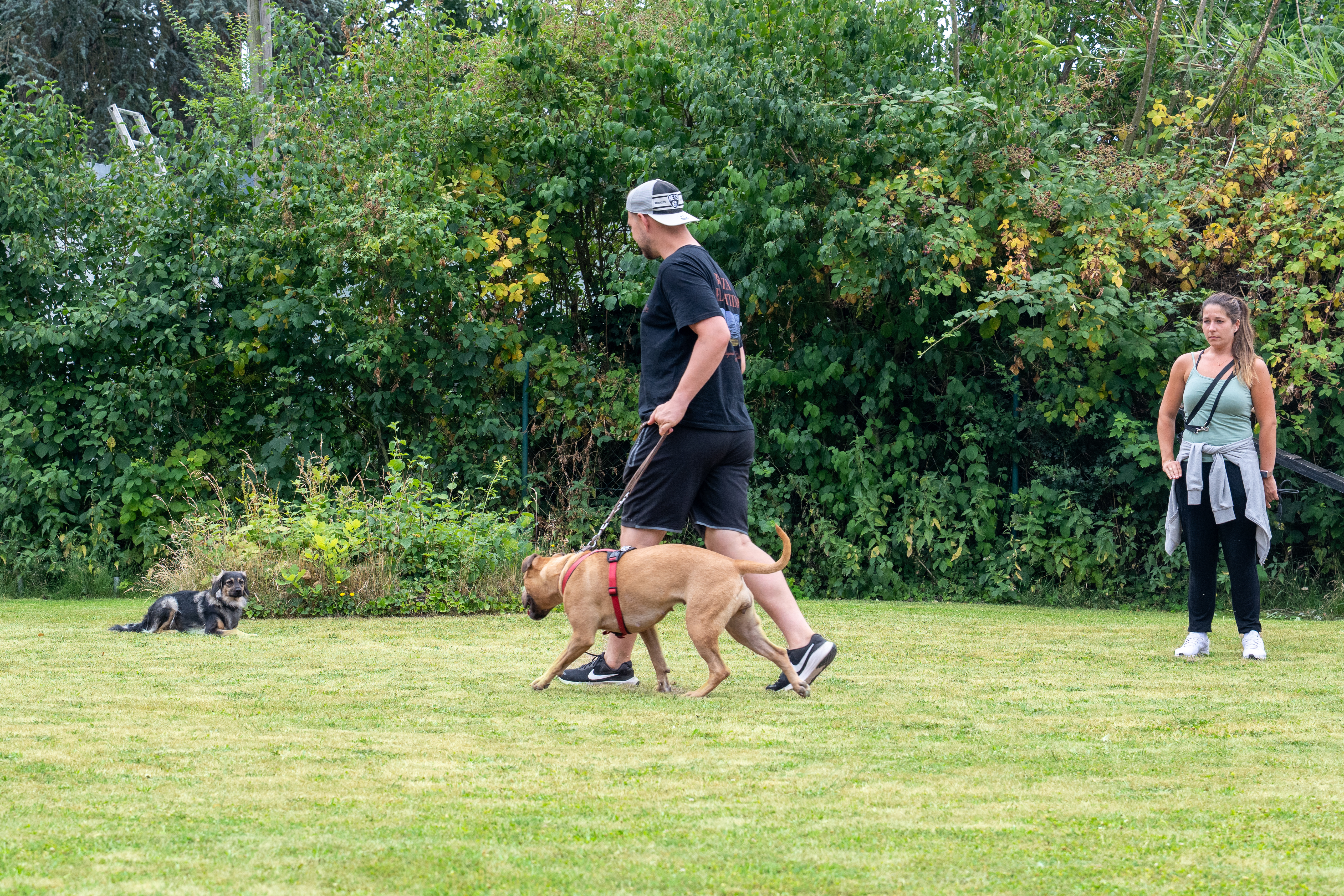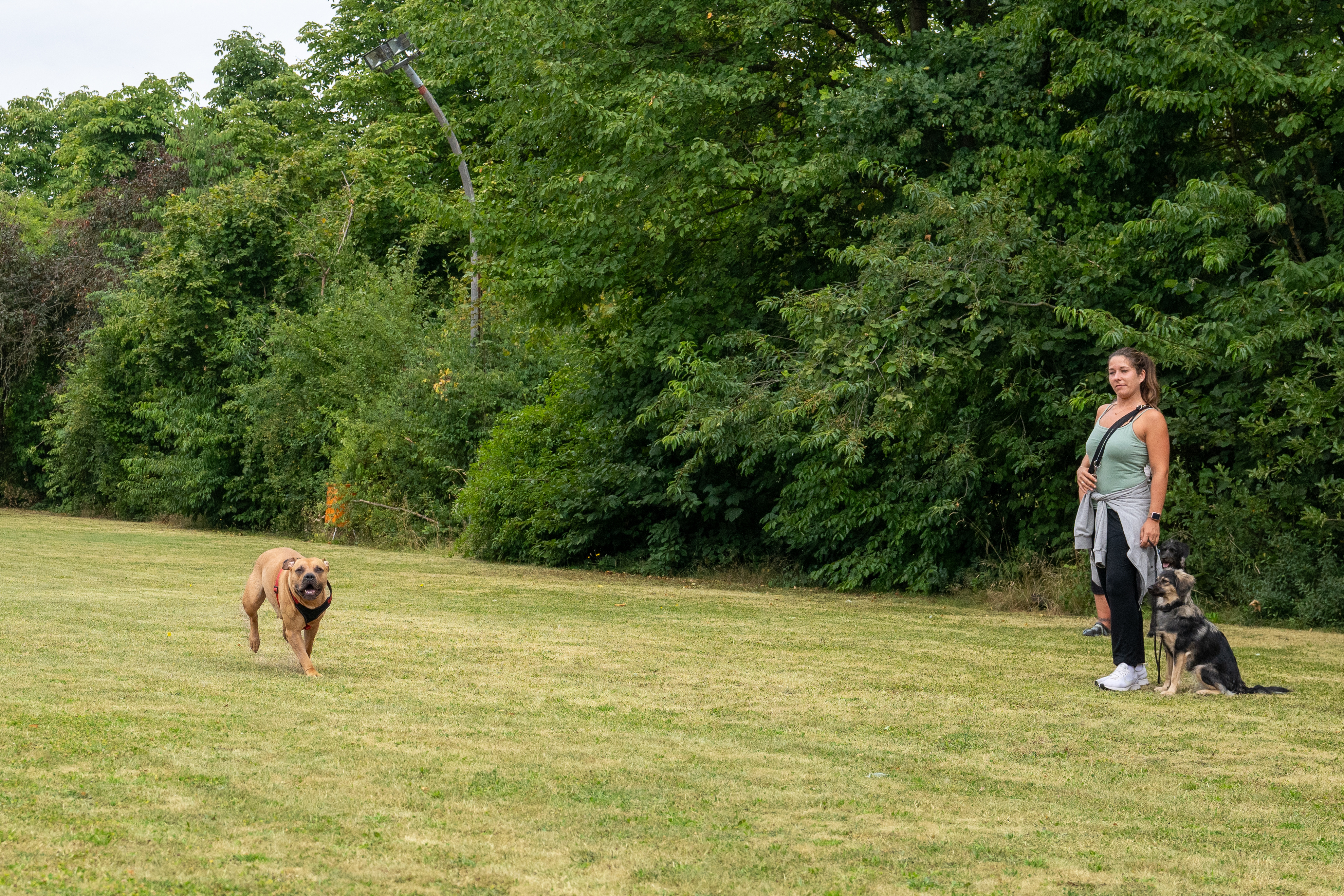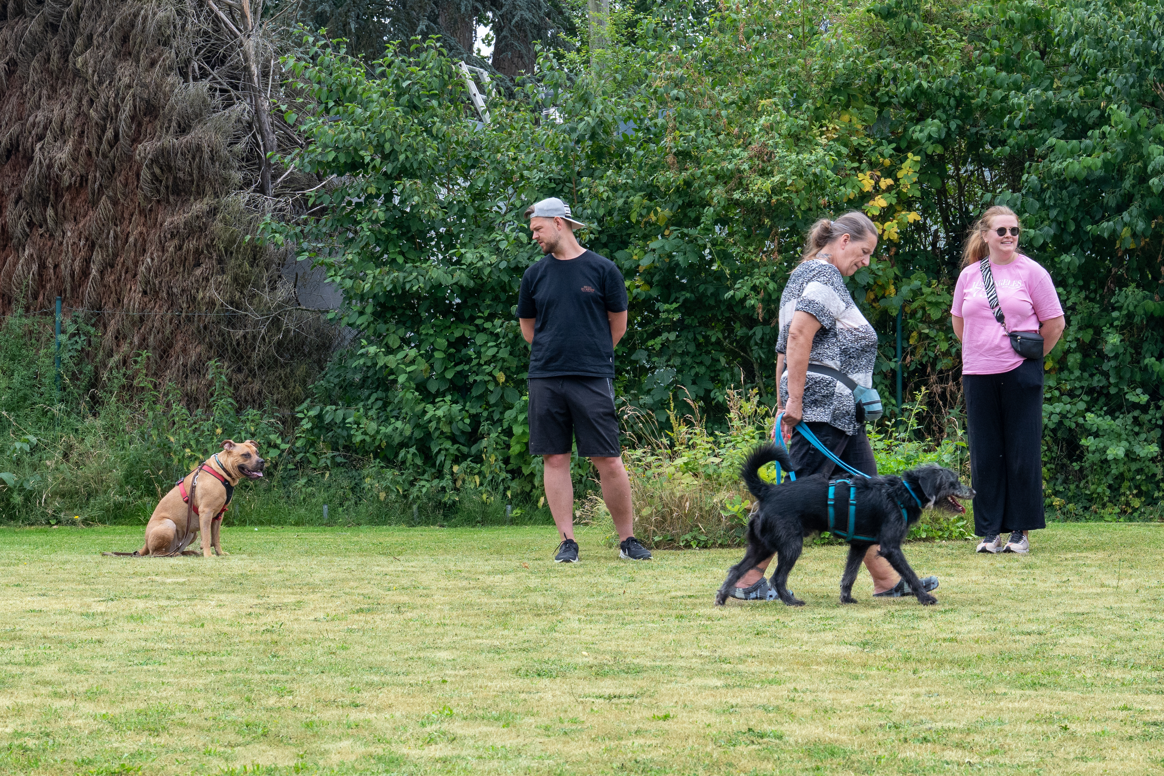 Individuelles Training Mensch-Hund, hier breitet sich der Mensch vor was er in der Trainigseinheit verbessern möchte und der Trainer unterstützt ihn dabei.